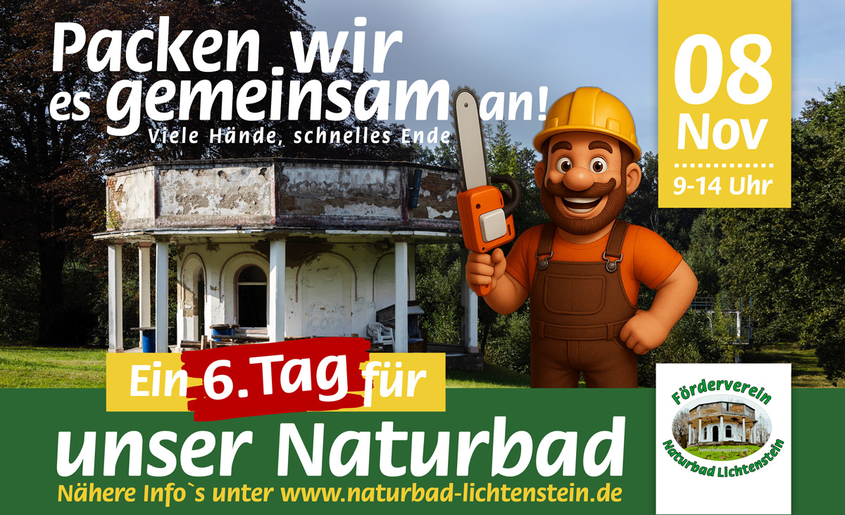 der „Förderverein Naherholungszentrum Naturbad Lichtenstein e.V“ ruft alle, die sich für unser Projekt engagieren und dafür mit anpacken wollen, zu einem weiteren gemeinsamen freiwilligen Arbeitseinsatz auf.